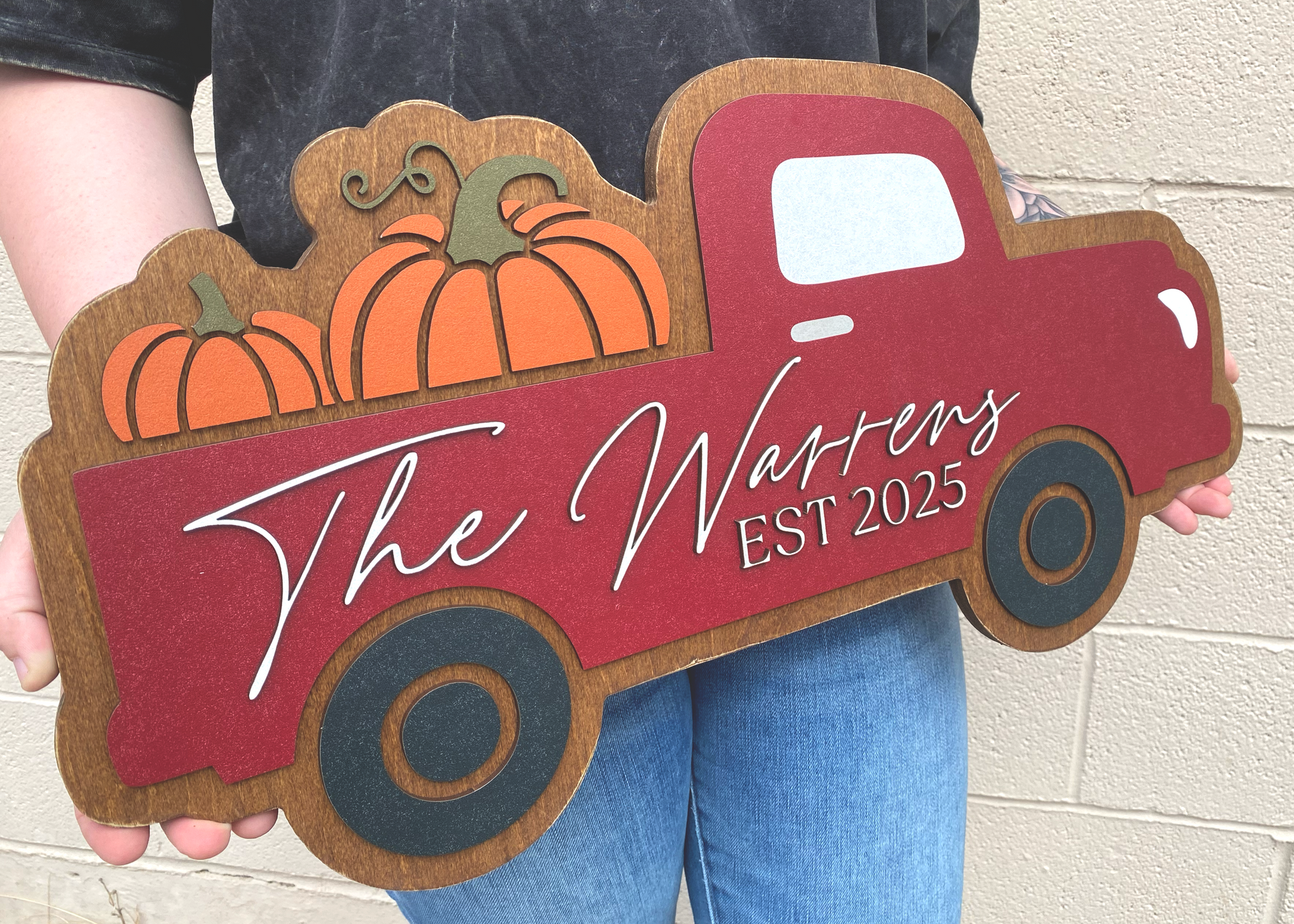 Truck in Maroon / Window in White / Tires in Black / Pumpkins in Terracotta and Olive